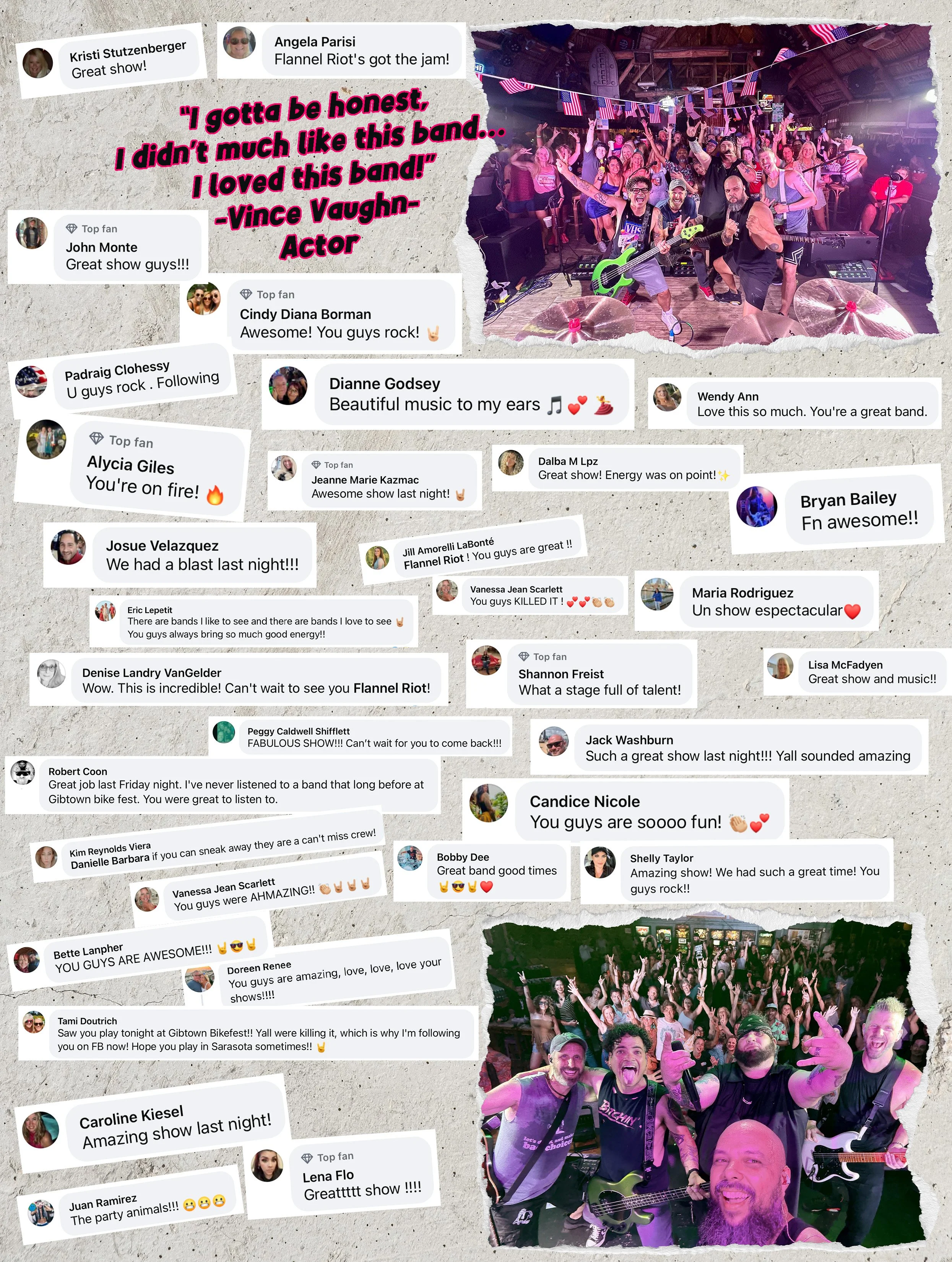 Far more than just a tribute act, Flannel Riot! has claimed first place in three Battle of the Bands competitions in both Tampa, FL and Washington, DC, while also opening for various national touring acts such as Collective Soul, Lee Brice and Dierks Bentley. They've also earned several nominations for the 2025 Creative Loafing Best of the Bay Awards, including Best Cover Band, Best Rock Band, Best Vocalist, and Best Singer/Songwriter.